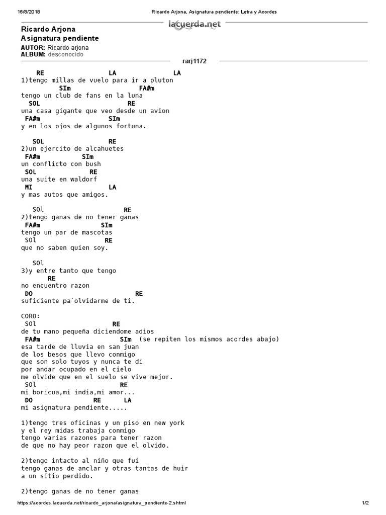 Ricardo Arjona Asignatura Pendiente Letra Y Acordes Acorde Musica Ocio