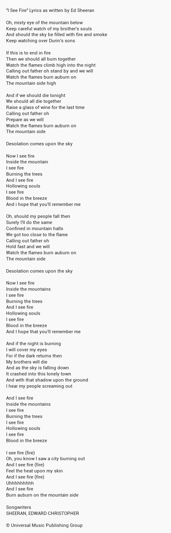 Servio Gbadamosi On Twitter I See Fire Lyrics As Written By Ed Sheeran Oh Misty Eye Of The Mountain Below Keep Careful Wa Http T Co Xo0tomw9xv