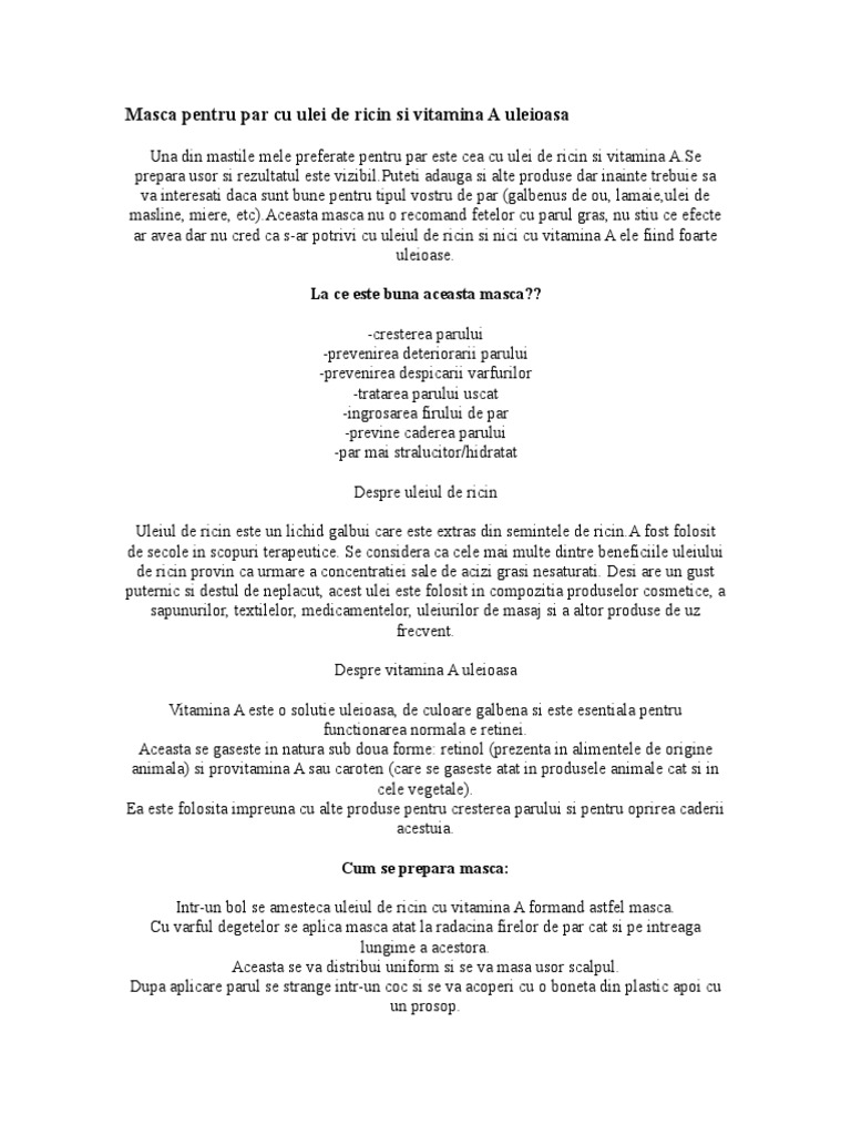 Masca Pentru Par Cu Ulei De Ricin Si Vitamina A Uleioasa
