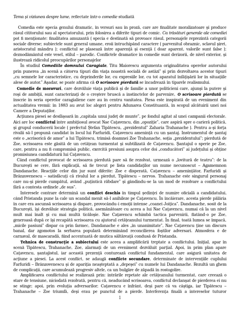 Tema Si Viziunea Comicul O Scrisoare Pierduta