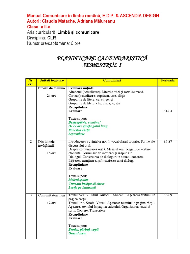 Doc Planificare Calendaristică Anuală Model Mircea Petrut Academia Edu