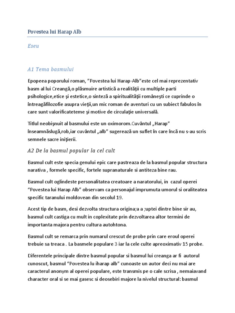 Povestea lui harap alb eseu. Povestea lui harap alb de ion creanga este un basm cult publicat in convorbiri literare 1877. Alături de alte opere similare precum ivan turbincă povestea lui stan păţitul sau povestea porcului basmul de față ilustrează preocuparea lui creangă pentru folclorul românesc. Opera data se numeste povestea lui harap alb si are ca an de aparitie 1877 publicata in revista convorbiri literare. Ipoteza opera literara apartine genului epic iar ca specie literara este un basm cult.