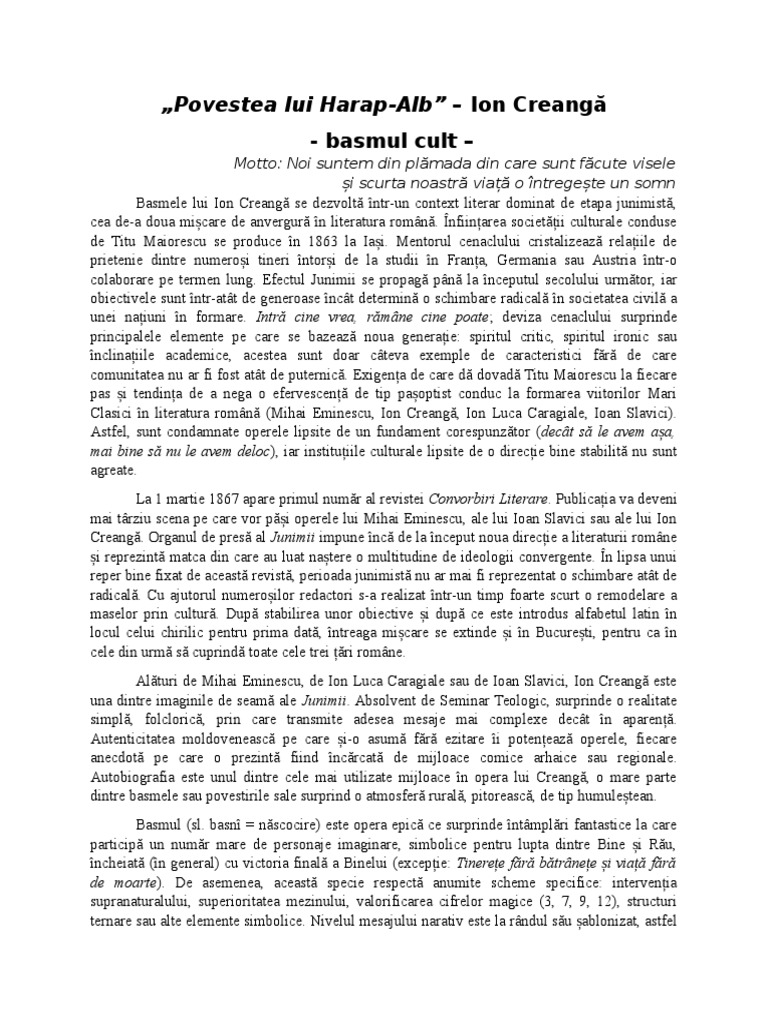 Povestea lui harap alb este un basm cult al cărui autor este ion creangă. Caracterul fantastic fabulos al operei calul năzdrăvan sfânta duminică puterea supranaturală a fetei împăratului roș prezența formulelor specifice amu cică era odată într o țară îndepărtată. Basmul cult este o specie a genului epic de mari dimensiuni în care acţiunea se desfasoară într o lume fabuloasă la care iau parte personaje cu puteri supranaturale iar binele triumfă în detrimentul răului. Basmul povestea lui harap alb a fost publicat în anul 1877 în revista convorbiri literare.